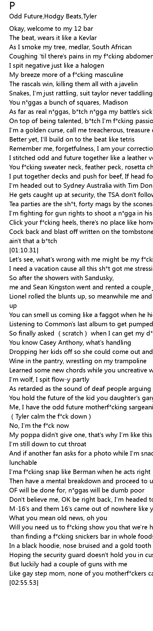 | [02:00.39] | Me, I have the odd future motherf*cking sargeaning |
