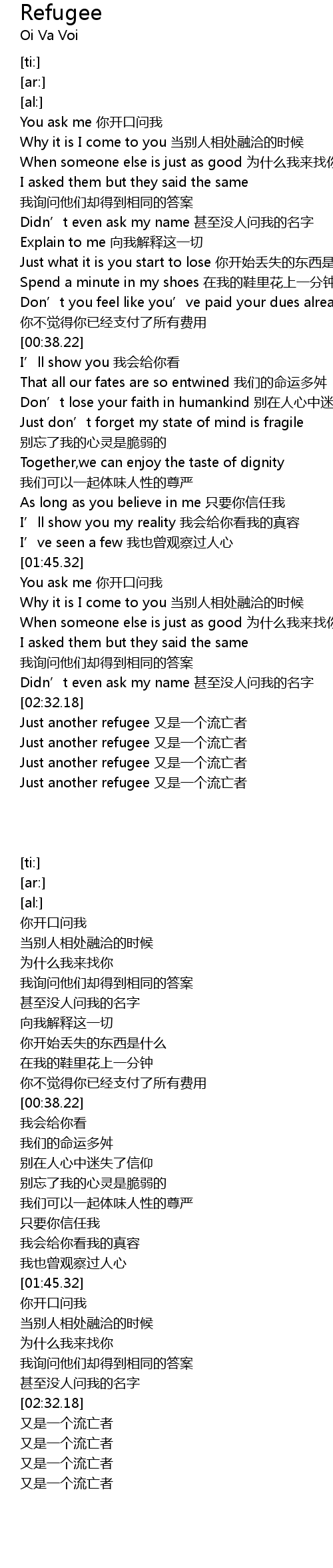 | [02:41.35] | Just another refugee yòu shì yí gè liú wáng zhě |