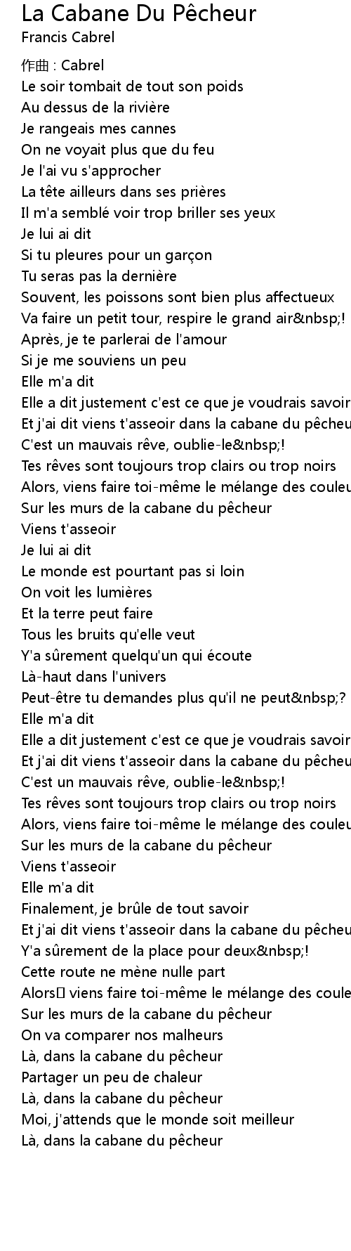 | Et j' ai dit viens t' asseoir dans la cabane du p cheur | |