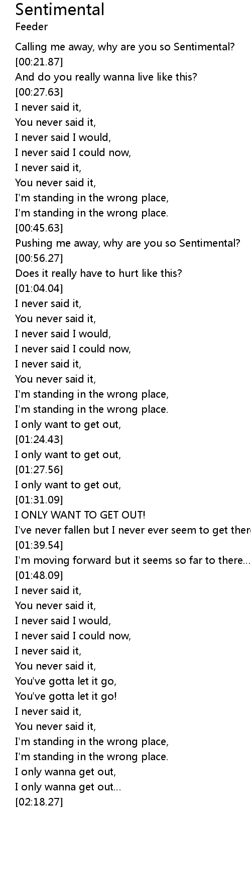 | [00:53.07] | Pushing me away, why are you so Sentimental? |