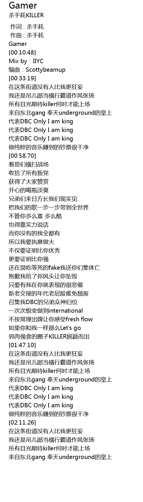 | [02:16.91] | suo you mu guang qi dai killer he shi cai neng shang chang |