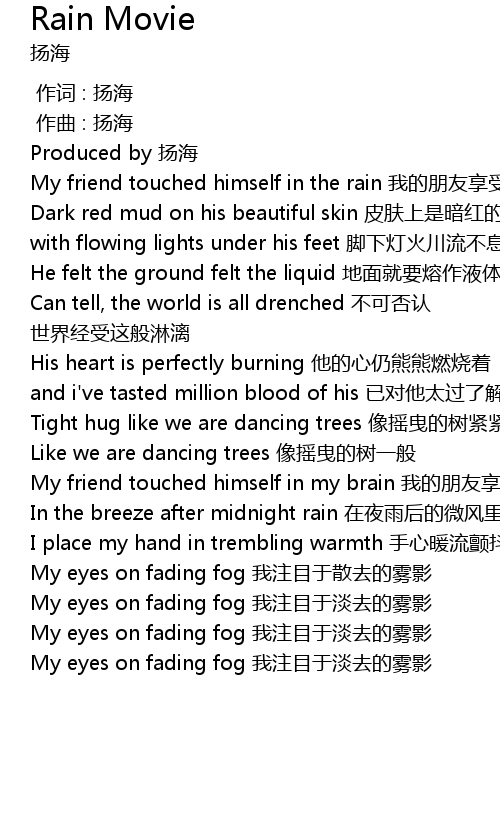 | [00:45.140] | My friend touched himself in the rain 我的朋友享受在这雨里 |