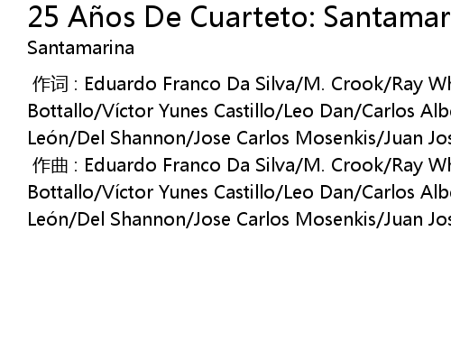 | [00:00.000] | 作曲 : Eduardo Franco Da Silva/M. Crook/Ray Whitley/Rubén Ismael Bottallo/Víctor Yunes Castillo/Leo Dan/Carlos Alberto Bottallo/David Carlos León/Del Shannon/Jose Carlos Mosenkis/Juan José Guillet |