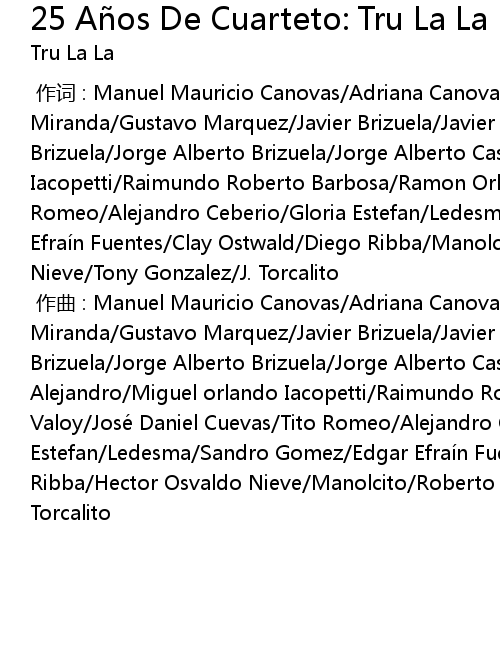 | [00:00.000] | zuò cí : Manuel Mauricio Canovas Adriana Canovas Delfor Ví ctor Miranda Gustavo Marquez Javier Brizuela Javier C. Brizuela Javier Carlos Brizuela Jorge Alberto Brizuela Jorge Alberto Casas M. Canovas Miguel orlando Iacopetti Raimundo Roberto Barbosa Ramon Orlando Valoy José Daniel Cuevas Tito Romeo Alejandro Ceberio Gloria Estefan Ledesma Sandro Gomez Ana Magdalena Edgar Efraí n Fuentes Clay Ostwald Diego Ribba Manolcito Roberto Adá n Domí nguez H. O. Nieve Tony Gonzalez J. Torcalito |
