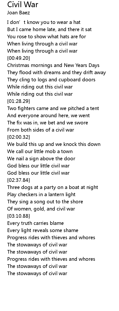| [01:32.95] | Two fighters came and we pitched a tent |