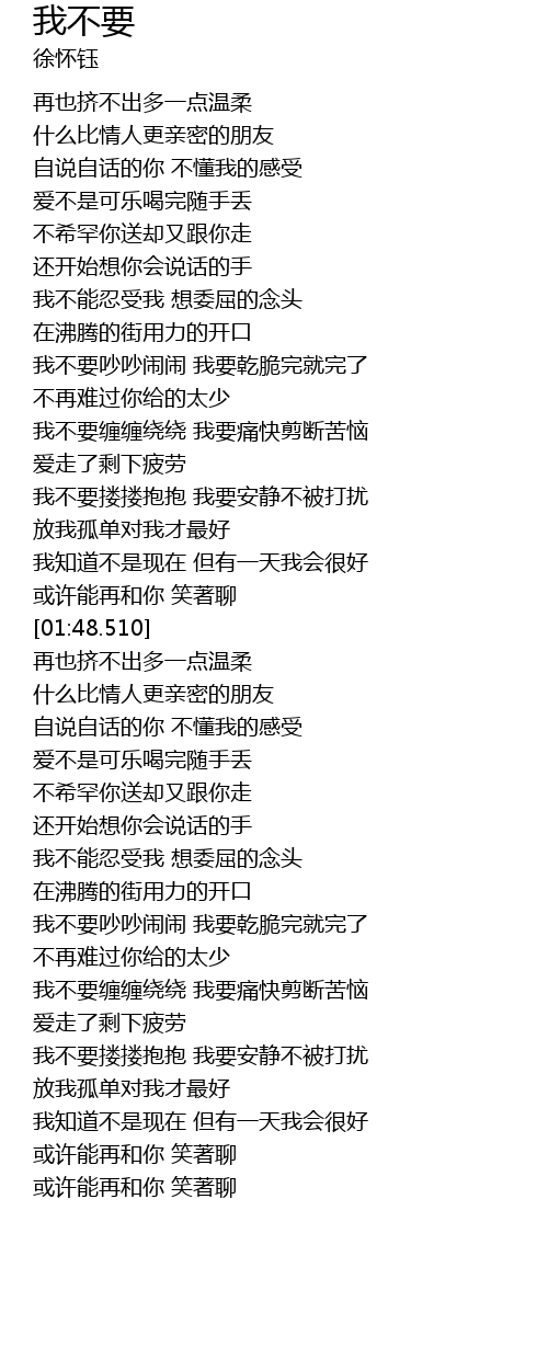 | [01:21.200] | 我不要搂搂抱抱 我要安静不被打扰 |