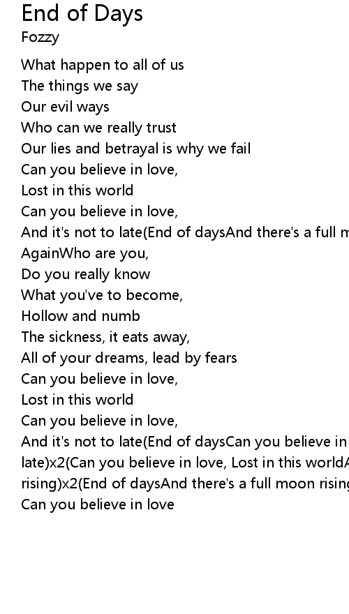 | And it's not to late(End of daysCan you believe in love, And it's not to late)x2(Can you believe in love, Lost in this worldAnd there's a full moon rising)x2(End of daysAnd there's a full moon rising)x4 | |