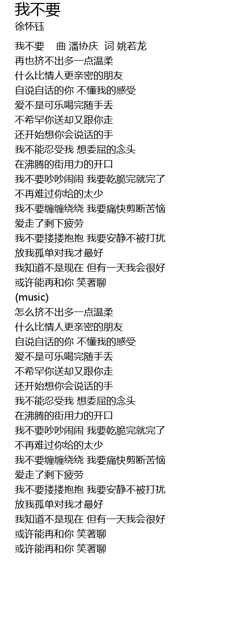 | [00:00] | 我不要 曲 潘协庆 词 姚若龙 |