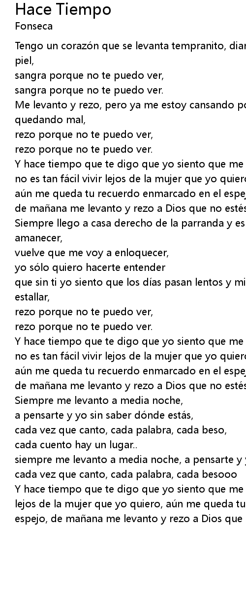 | Y hace tiempo que te digo que yo siento que me muero, no es tan fa cil vivir lejos de la mujer que yo quiero, au n me queda tu recuerdo enmarcado en el espejo, de ma ana me levanto y rezo a Dios que no este s lejos. bis |
