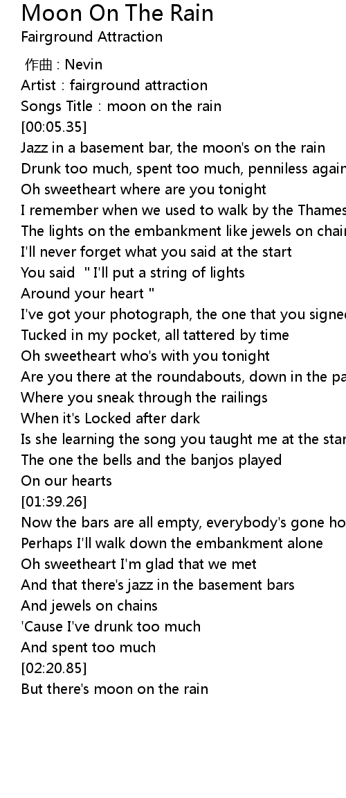 | [00:13.26] | Jazz in a basement bar, the moon's on the rain |