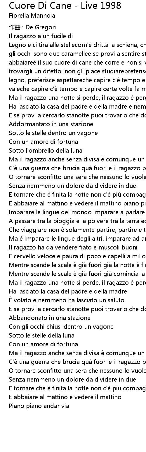 | Legno e ci tira alle stellecom'è dritta la schiena, che bianchi i suoi dentie gli occhi sono due caramellee se provi a sentire stanotte puoi sentire abbaiareè il suo cuore di cane che corre e non si vuole fermare. Il ragazzo a trovargli un difetto, non gli piace studiarepreferisce le stelle e quel pezzo di legno, preferisce aspettareche capire c'è tempo e capire certe volte non valeche capire c'è tempo e capire certe volte fa male. | |