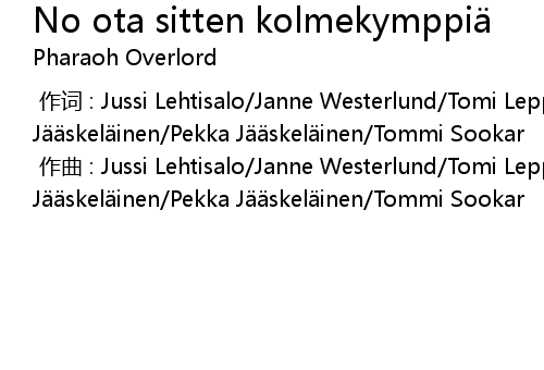 | [00:00.000] | zuò cí : Jussi Lehtisalo Janne Westerlund Tomi Lepp nen Julius J skel inen Pekka J skel inen Tommi Sookar |