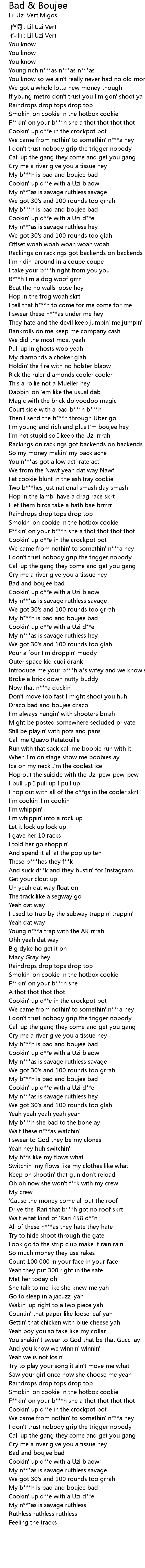 | [00:37.04] | My b***h is bad and boujee bad |