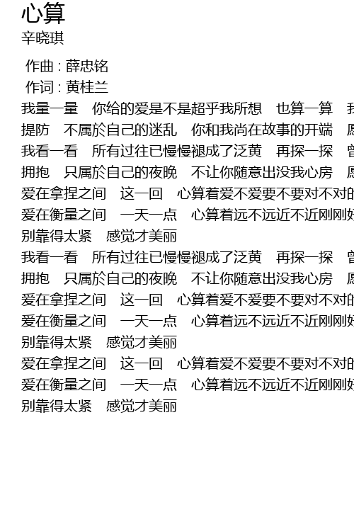 | [00:19.329] | 我量一量 你给的爱是不是超乎我所想 也算一算 我的情感是否逐次都还 |