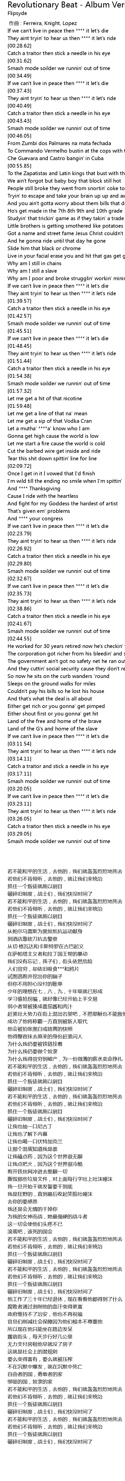 | [00:56.61] | To the Zapatistas and Latin kings that bust with that Rugger. |