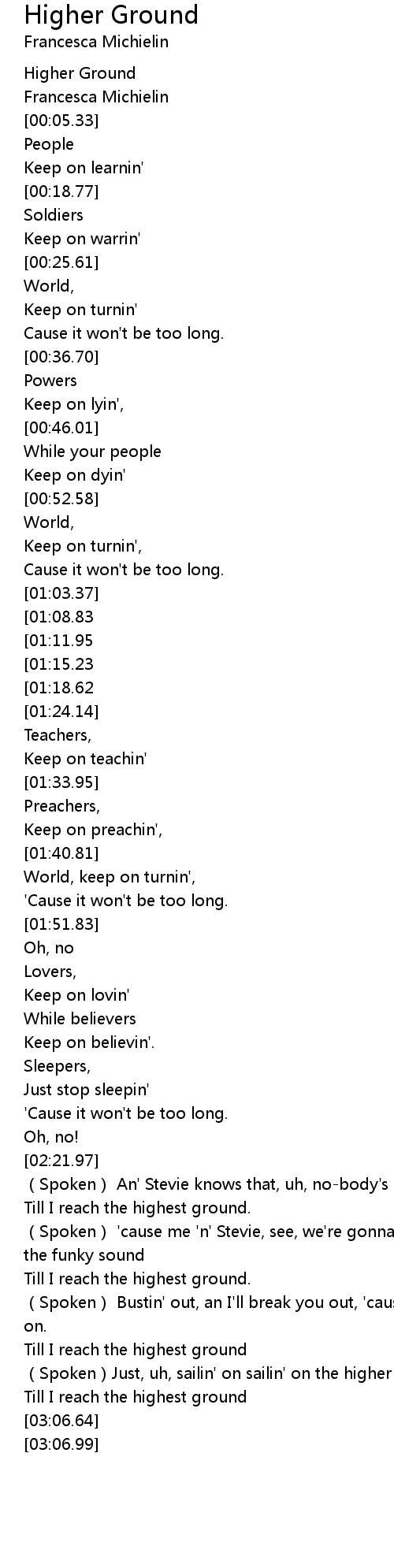 | [02:59.93] | (Spoken)Just, uh, sailin' on sailin' on the higher ground |