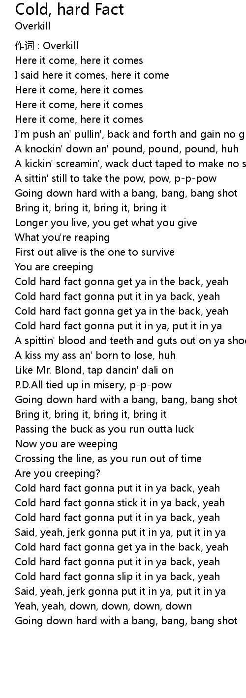 | Cold hard fact gonna slip it in ya back, yeah | |