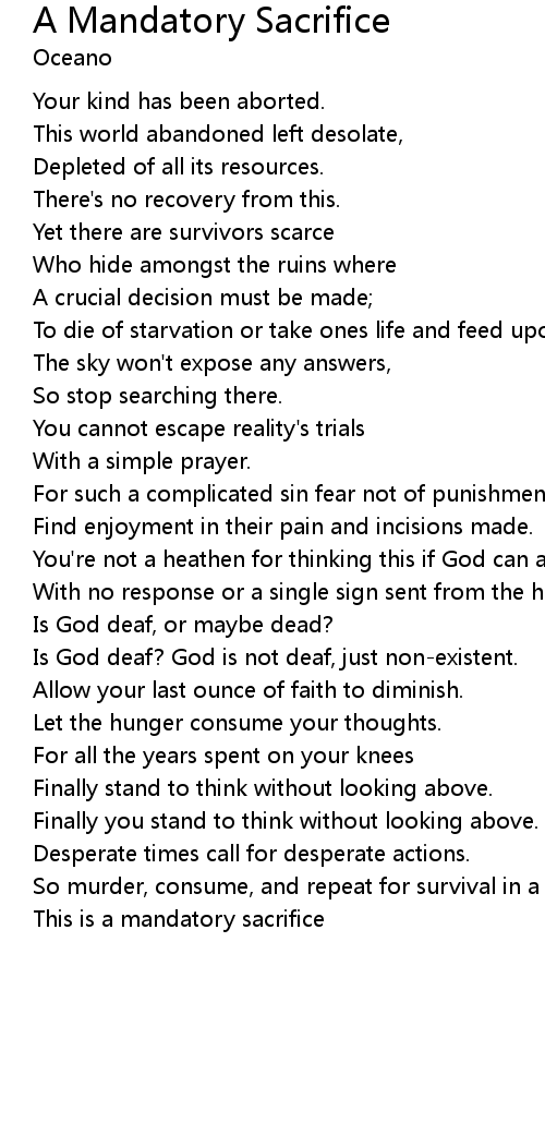 | To die of starvation or take ones life and feed upon their flesh. | |