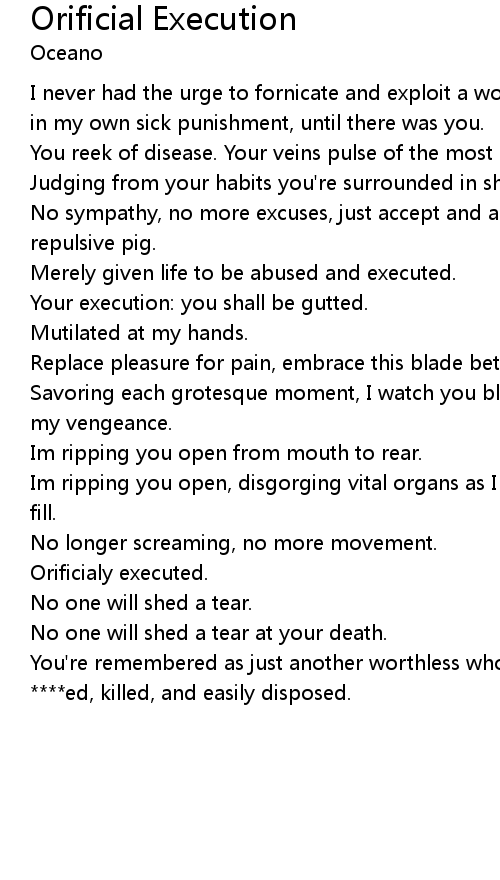 | Savoring each grotesque moment, I watch you bleed from every orifice to appease my vengeance. | |