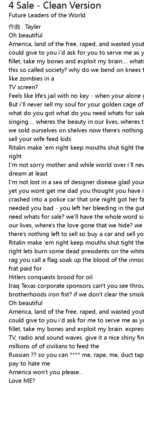 | I' m not lost in a sea of designer disease glad your pleased to be i ain' t dead yet you wont get me dad you thought you have it figured out so right till mom crashed into a police car that one night got her face smashed back cracked she needed you bad you left her bleeding in the gutter what do you got what do you need whats for sale? we' ll have the whole word singing.... where' s the beauty in our lives, where' s the love gone that we hide? we sold ourselves on shelves now there' s nothing left to sell so buy a car and sell your wife feed kids | |
