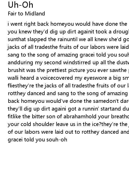 i went right back homeyou would have done the sameand never washed your handsif you knew they'd dig up dirt againit took a droughtto wash her outso i was the sunthat slapped the rainuntil we all knew she'd go down the drainthey're the jacks of all tradesthe fruits of our labors were laid out to rotthey danced and sang to the song of amazing gracei told you souh-ohi got a runnin' start andduring my second windstirred up all the dustwith an iron fist and her hair brushit was the prettiest picture you ever sawthe prettiest picture not on the walli heard a voicecovered my eyeswore a big smile when we dropped like fliesthey're the jacks of all tradesthe fruits of our labors were laid out to rotthey danced and sang to the song of amazing gracei told you soi went right back homeyou would've done the samedon't dare wash your handswe both know they'll dig up dirt againi got a runnin' startand during my second wind had a fitlike the bitter son of abrahamhold your breathdid you see the light?or did your cold shoulder leave us in the ice?they're the jacks of all tradesthe fruits of our labors were laid out to rotthey danced and sang to the song of amazing gracei told you souh-oh |