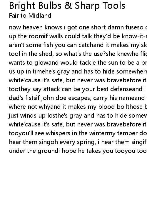 now heaven knows i got one short damn fuseso come sit down a spell while i light up the roomif walls could talk they'd be know-it-allsso we live in the sticksand aren't some fish you can catchand it makes my skin crawli'm not the sharpest tool in the shed, so what's the use?she knewhe flights like hell because he wants to glowand would tackle the sun to be a bright bulbi wonder if he'll wake us up in timehe's gray and has to hide somewhere in between black and white'cause it's safe, but never was bravebefore it's overi hope he takes you toothey say attack can be your best defenseand i got mother's smileand both my dad's fistsif john doe escapes, carry his nameand when it's time to signask where not whyand it makes my blood boilthose black letter daysall their mail just winds up losthe's gray and has to hide somewhere in between black and white'cause it's safe, but never was bravebefore it's overi hope he takes you tooyou'll see whispers in the wintermy temper doesn't laughand every spring, i hear them singoh every spring, i hear them singif he's goin' downif he's goin' under the groundi hope he takes you tooyou too |