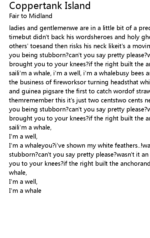 ladies and gentlemenwe are in a little bit of a predicamenthe said take your timebut didn't back his wordsheroes and holy ghostswhich one of you stepson the others' toesand then risks his neck likeit's a moving target?you?was that just you being stubborn?can't you say pretty please?wasn't it an eggshell carpetthat brought you to your knees?if the right built the anchorand the wrong have set saili'm a whale, i'm a well, i'm a whalebusy bees and worry wortswe are not in the business of fireworksor turning headsthat whistle in the darksitting ducks and guinea pigsare the first to catch wordof straws in the wind don't stop themremember this it's just two centstwo cents never made you richwas that just you being stubborn?can't you say pretty please?wasn't it an eggshell carpetthat brought you to your knees?if the right built the anchorand the wrong have set saili'm a whale, |