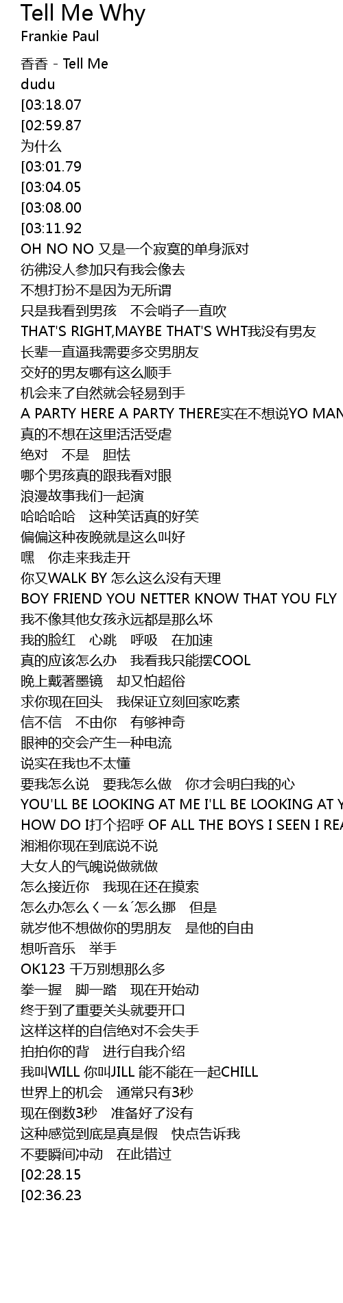 | [03:32.22][02:59.87][02:43.19][01:39.45][00:51.78][00:03.43] | JUST TELL ME 为什么 |