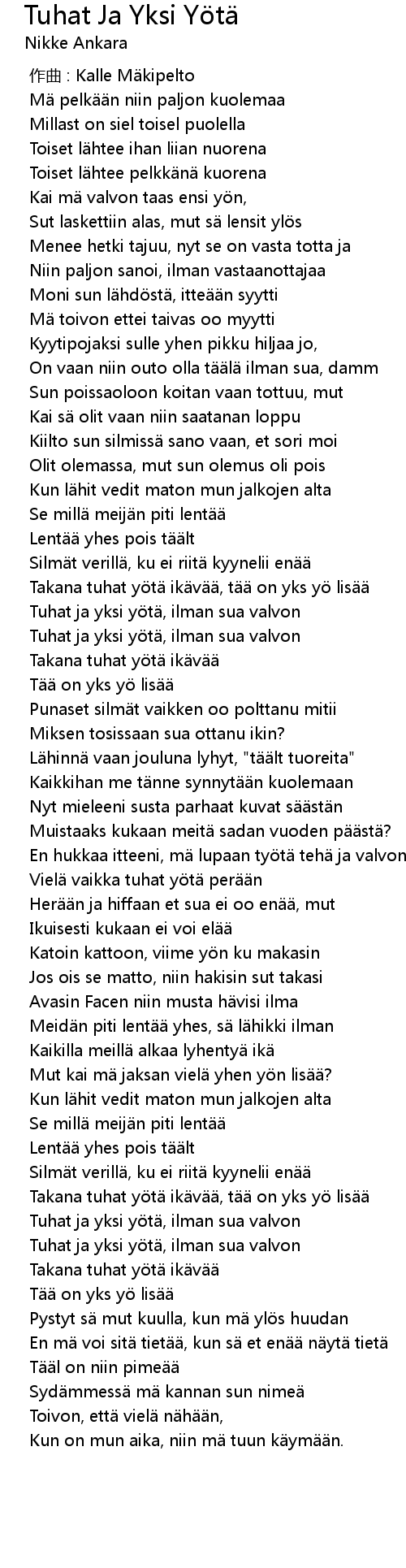 | [01:05.482] | Takana tuhat yötä ikävää, tää on yks yö lisää |