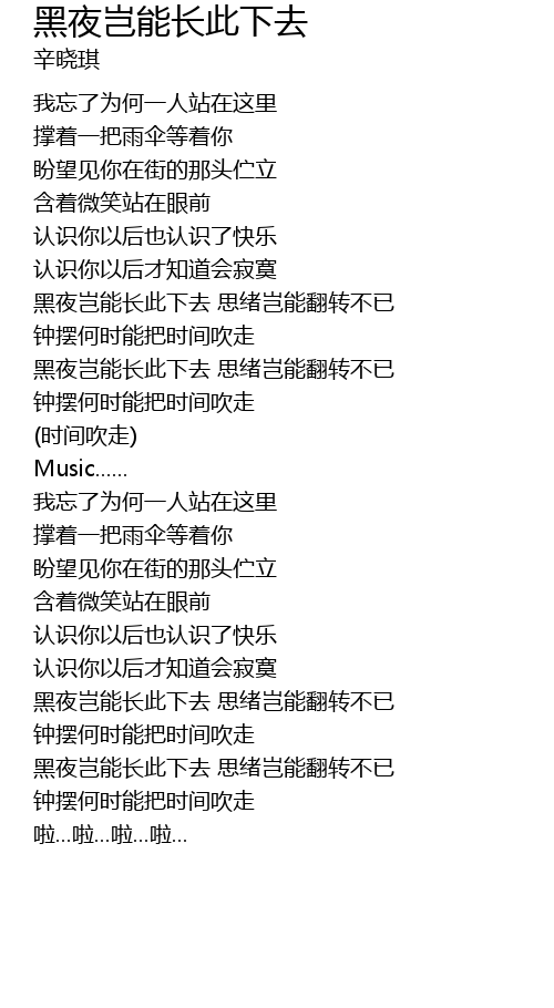 | [01:09.040] | hēi yè qǐ néng zhǎng cǐ xià qù sī xù qǐ néng fān zhuǎn bù yǐ |
