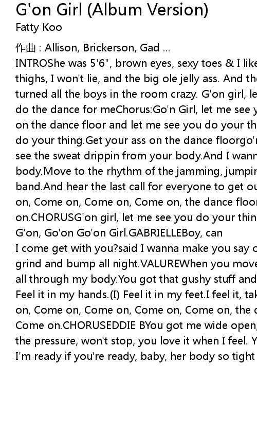 | [2x] | INTROShe was 5'6", brown eyes, sexy toes & I liked her smile. Yes she was. Nice thighs, I won't lie, and the big ole jelly ass. And the way she danced, she turned all the boys in the room crazy. G'on girl, let me see you do the dance, do the dance for meChorus:Go'n Girl, let me see you do your thing. Get your ass on the dance floor and let me see you do your thing. Go'n girl. Let me see you do your thing.Get your ass on the dance floorgo'n, go'n, go'n girl.JOSHUAI wanna see the sweat drippin from your body.And I wanna feel your heart vibrating my body.Move to the rhythm of the jamming, jumping, funking in front of the band.And hear the last call for everyone to get out and dance. So.Come on, Come on, Come on, Come on, Come on, the dance floor's filling up so Come on, Come on.CHORUSG'on girl, let me see you do your thing. Get your ass on the dance floor, let me see you do your thing G'on, Go'on Go'on Girl.GABRIELLEBoy, can I come get with you?said I wanna make you say ooh,Give it up that funk. Let's grind and bump all night.VALUREWhen you move in slow motion, baby.Sends chills all through my body.You got that gushy stuff and I want to have ya, baby.RON(I) Feel it in my hands.(I) Feel it in my feet.I feel it, taking control of me.Come on, Come on, Come on, Come on, Come on, the dance floor's filling up so Come on, Come on.CHORUSEDDIE BYou got me wide open, focused, I'm feelin your body. Feelin the pressure, won't stop, you love it when I feel. You tell me your fantasies, I'm ready if you're ready, baby, her body so tight & soCHORUS |
