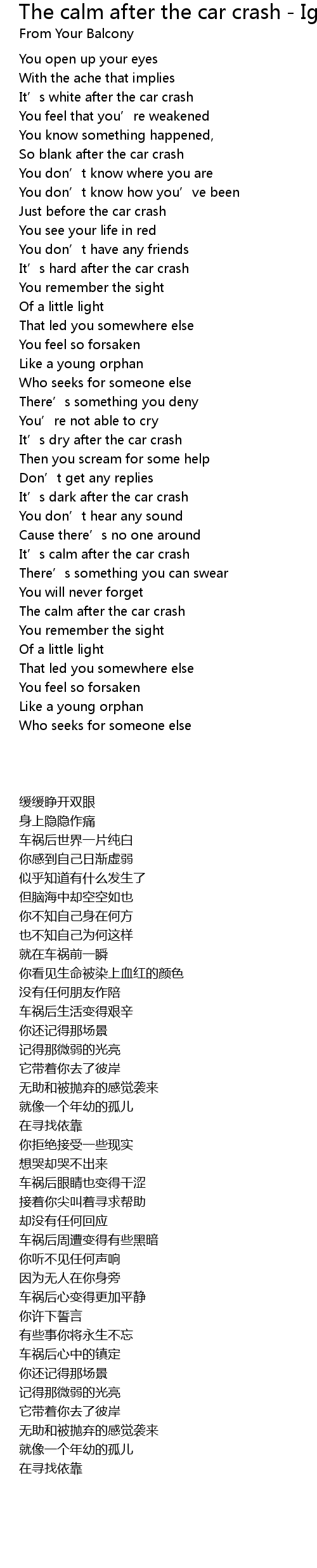 | Song | The calm after the car crash - Ignition mix by Allegra Gellar |