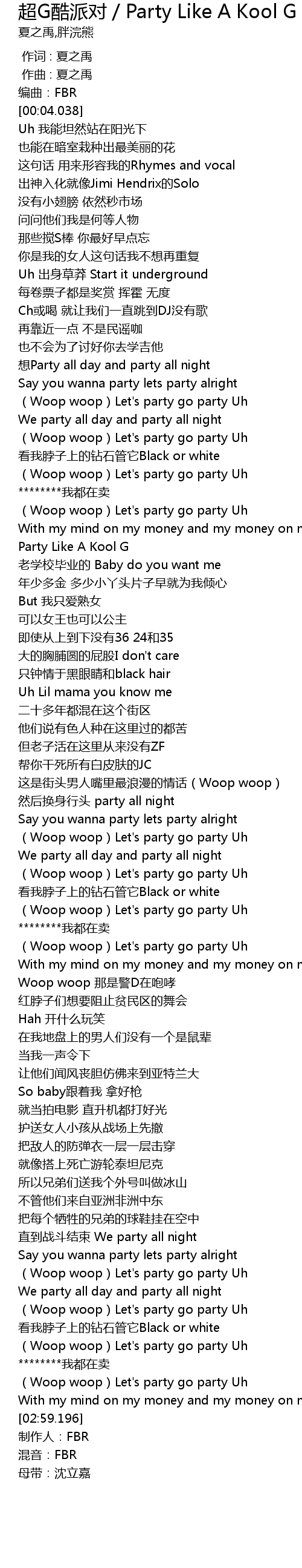 | [02:49.917] | (Woop woop)Let's party go party Uh |