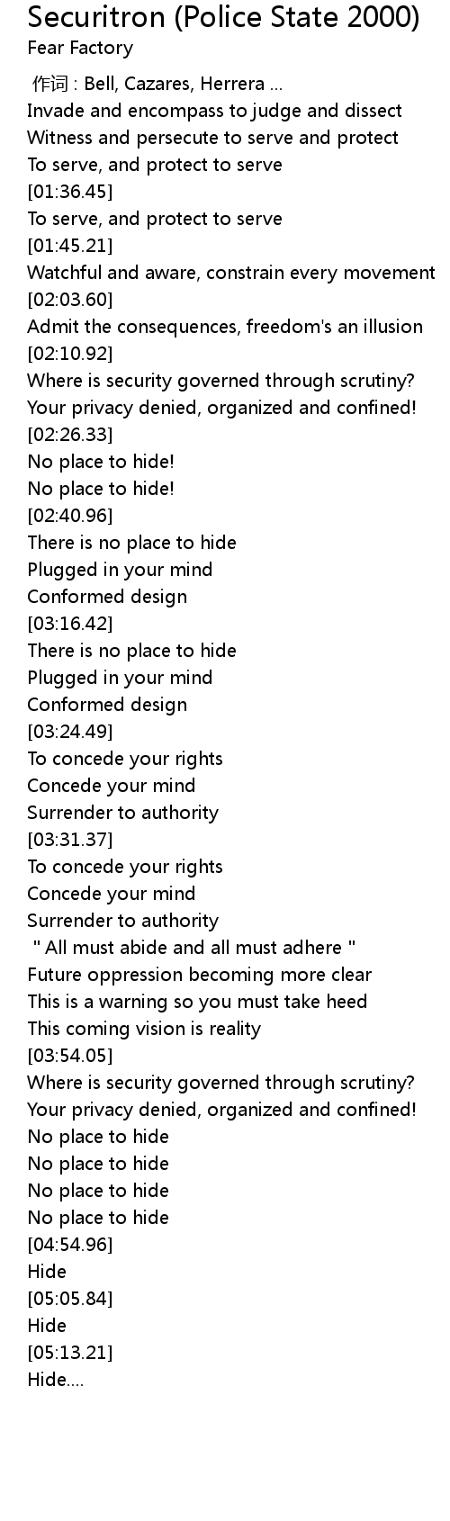 | [04:17.90] | Your privacy denied, organized and confined! |