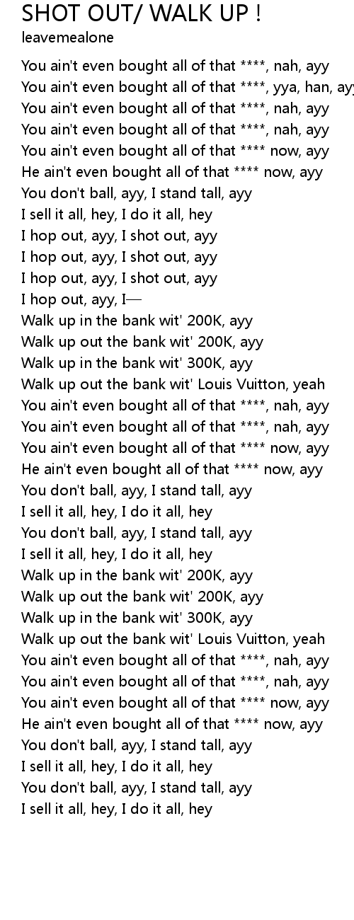| [00:26.86] | I hop out, ayy, I shot out, ayy |