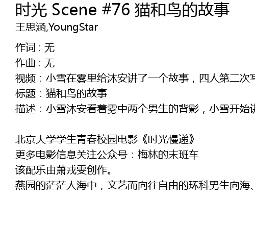 | miáo shù: xiǎo xuě mù ān kàn zhe wù zhōng liǎng gè nán shēng de bèi yǐng, xiǎo xuě kāi shǐ jiǎng gù shì, qián bàn duàn yīng gāi shì yǒu xiē shāng gǎn de, yīn wèi zhè gè gù shì àn shì le xiǎo xuě hé xiàng hǎi fēn kāi de jié jú, zhè duàn de chōng tū yīn yuè bù yīng gāi zhè me qiáng liè, hòu bàn duàn yīn yuè wǒ jué de kě yǐ yǒu xiē xǔ qíng xù shàng de áng yáng dàn shì hái shì piān yōu yù. | |