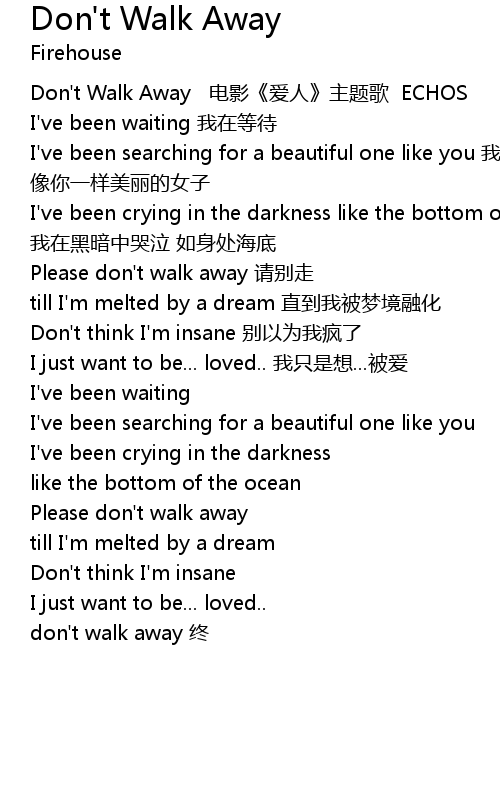 | [00:43.50] | Please don' t walk away qǐng bié zǒu |