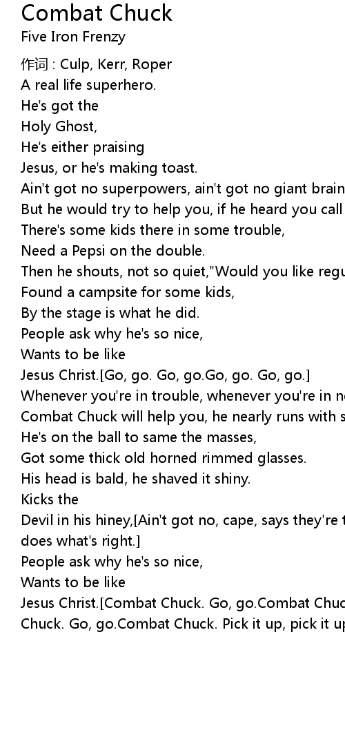 | Jesus Christ. Combat Chuck. Go, go. Combat Chuck. Pick it up, pick it up. Combat Chuck. Go, go. Combat Chuck. Pick it up, pick it up. |