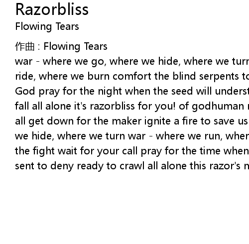 | God pray for the night when the seed will understand carry the light stand up to fall all alone it's razorbliss for you! of godhuman nature it's razorbliss for all get down for the maker ignite a fire to save us all war - where we go, where we hide, where we turn war - where we run, where we ride, where we burn break up the fight wait for your call pray for the time when we scream your name again sent to deny ready to crawl all alone this razor's meant for you! |