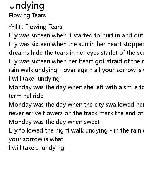 | Lily followed the night walk undying - in the rain walk undying - over again all your sorrow is what | |