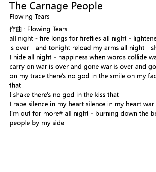 | I hide all night happiness when words collide war is over and tonight we' ll carry on war is over and gone war is over and gone there' no god, there' s no god on my trace there' s no god in the smile on my face there' s no god in the hands that | |