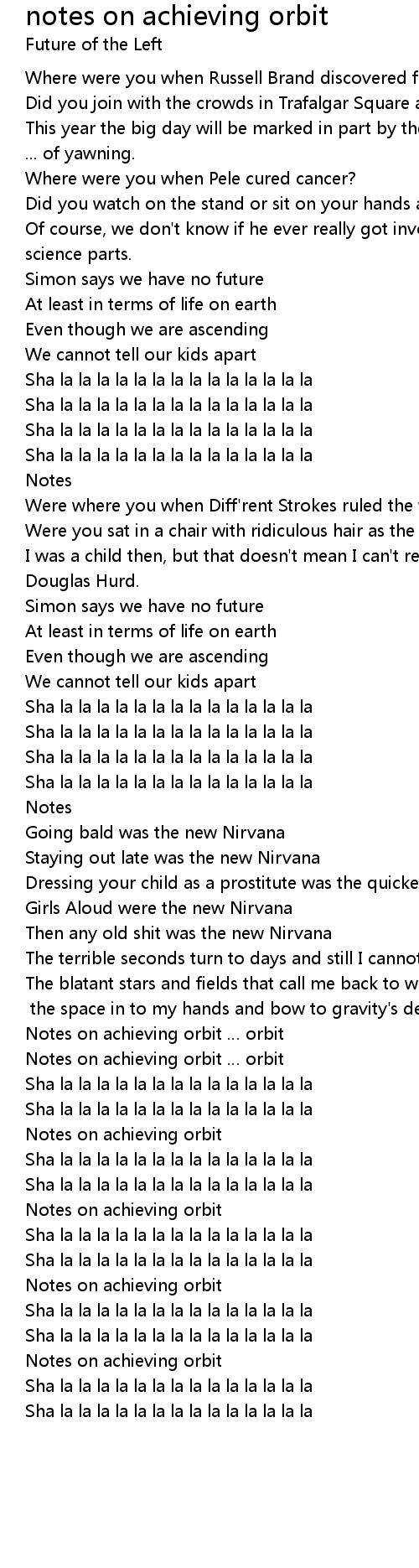 | Song | notes on achieving orbit |