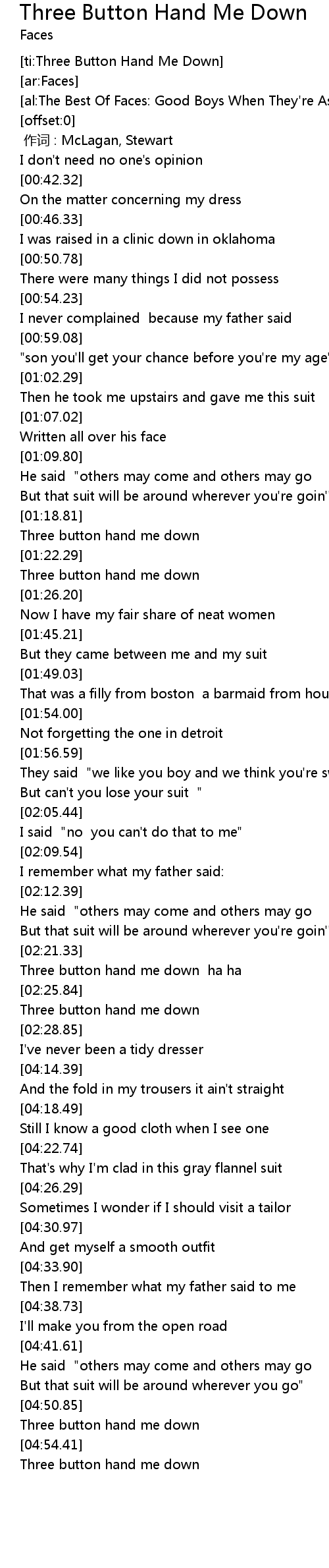 | [02:17.74] | But that suit will be around wherever you're goin'" |