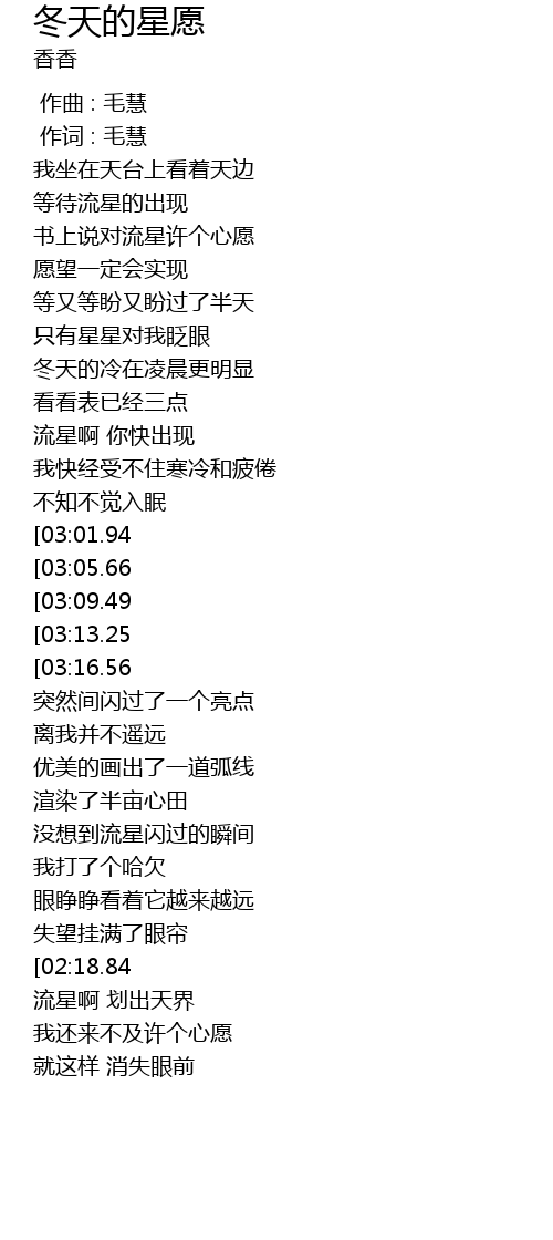 | [03:24.89][03:01.94][02:04.11][01:07.00] | 舒拉拉舒拉拉 流星啊 |