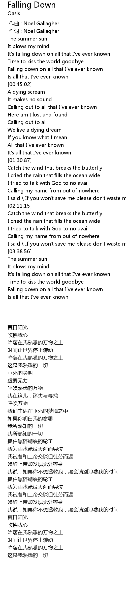 | [00:34.93] | Falling down on all that I' ve ever known |