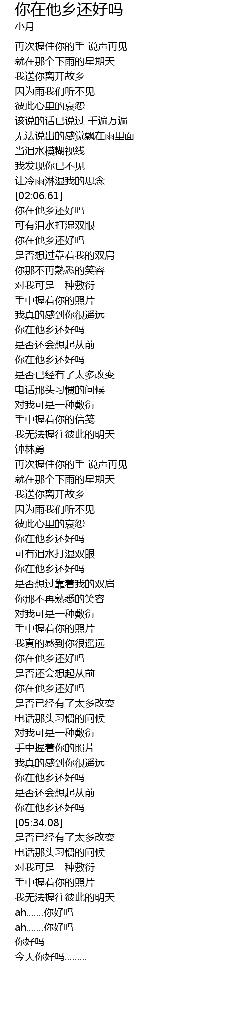 [05:31.36] nǐ zài tā xiāng hái hǎo ma