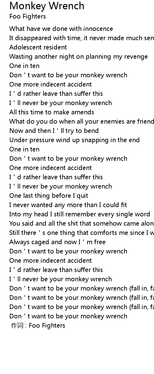 | [03:25] | Don t want to be your monkey wrench fall in, fall out |