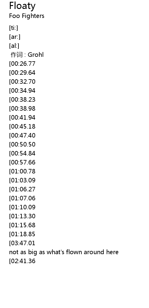 | [03:53.30][03:47.01][03:40.57][03:34.22][02:36.50][02:30.21][02:23.83][02:17.48][01:42.01][01:35.72][01:29.33][01:22.93] | That' s not as big as what' s flown around here |