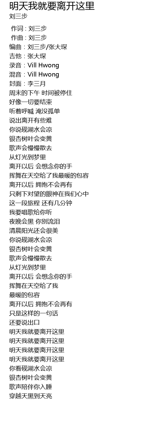 | [04:43.629] | míng tiān wǒ jiù yào lí kāi zhè lǐ |