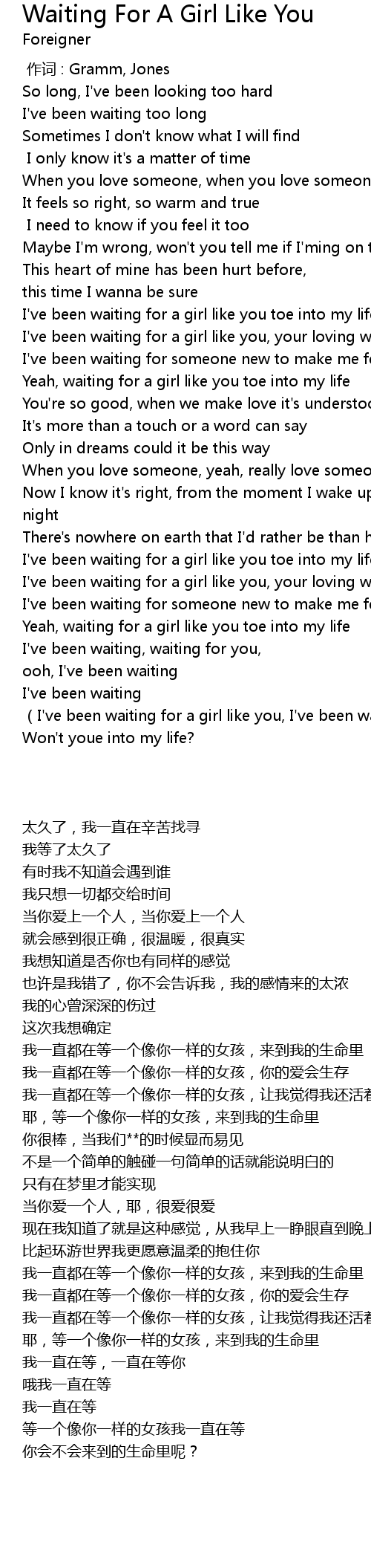 | [04:27.00] | I' ve been waiting for a girl like you, I' ve been waiting |